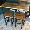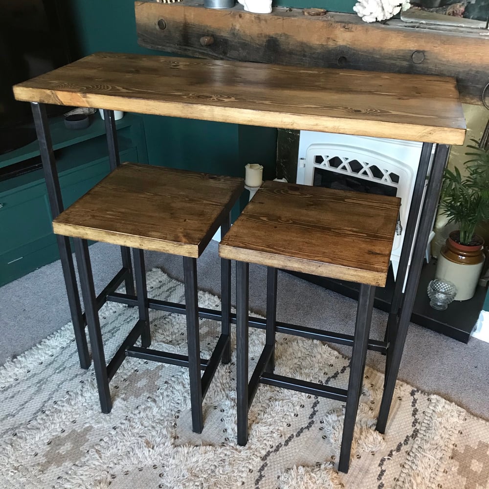 Table measures: W100cm x D40cm x H90cm each stool measures: W35cm square x H65cm